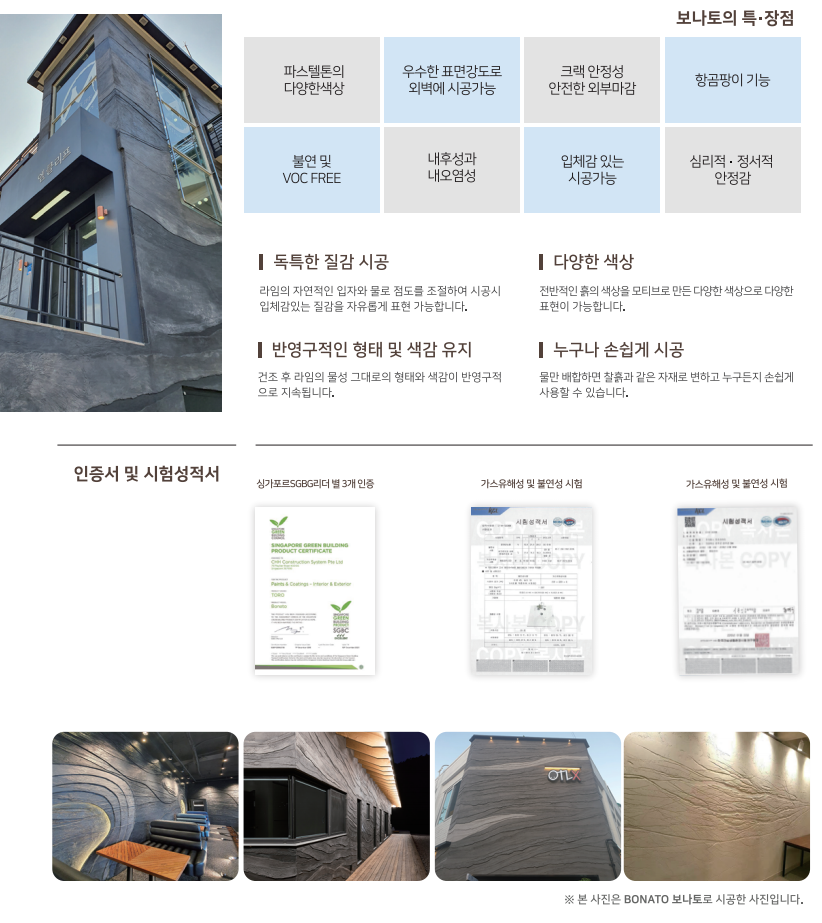 백토와 천연라임이 주원료인 내·외부 미장재로 수려한 외관을 연출하는 고급 마감재입니다. 보나토는 쉽고 빠르게 미장 할 수 있고, 음각·양각 등 특유의 아트패턴을 구현해 낼 수 있어, 벽면의 장식효과가 뛰어납니다. 휘발성 유기화합물을 함유하지 않은 무기계 제품입니다.